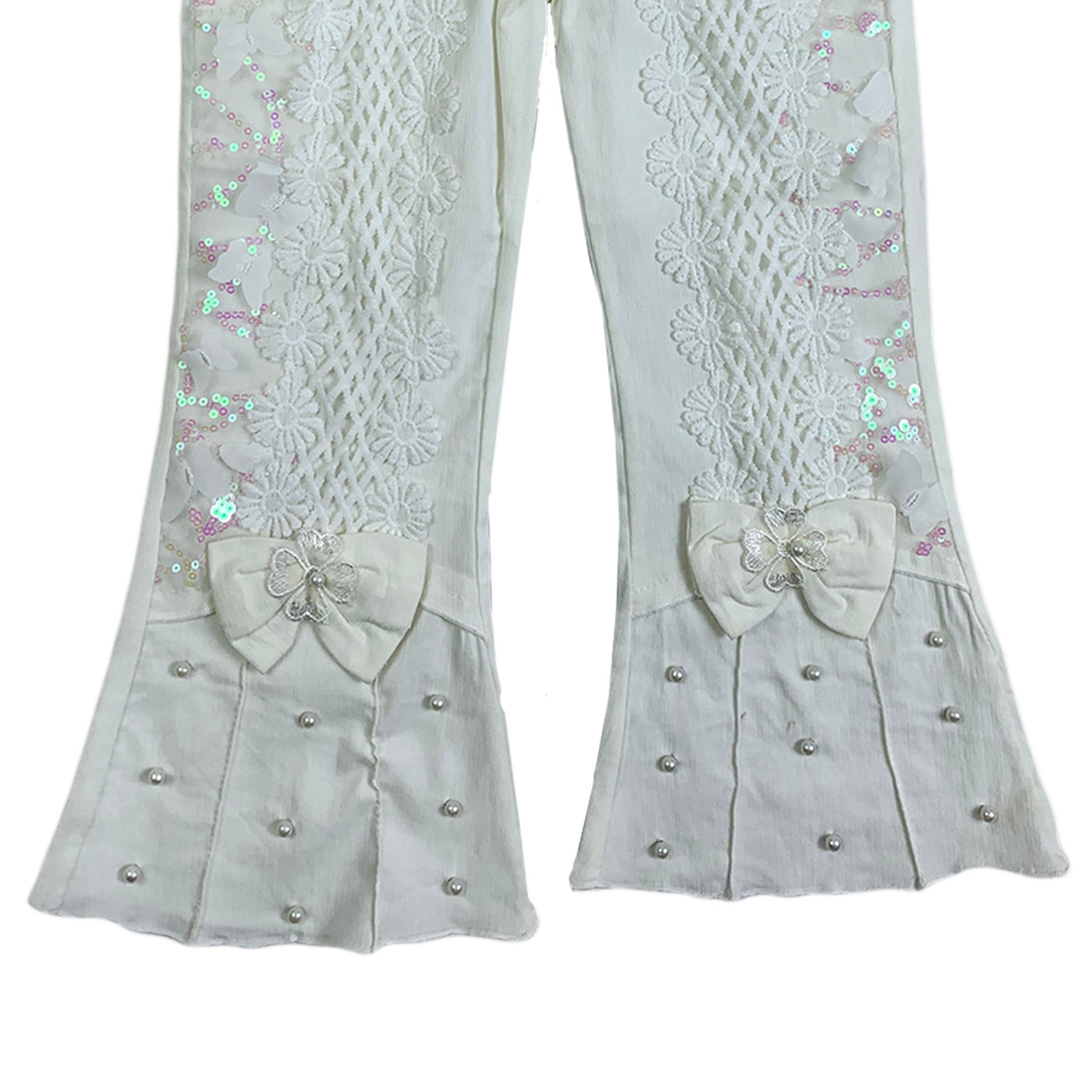 Girls Fancy White Trouser – Pearl & Lace Design with Elegant Bows