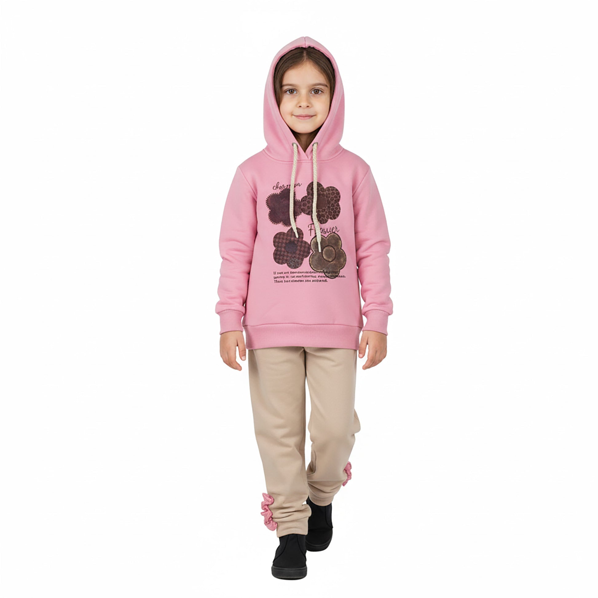 This Girls Terry Co-ord Set features a soft light green hooded top with floral print and text detail, paired with comfy pink jogger trousers. Made from premium terry fabric, it’s warm, breathable, and perfect for everyday wear during the cool season.