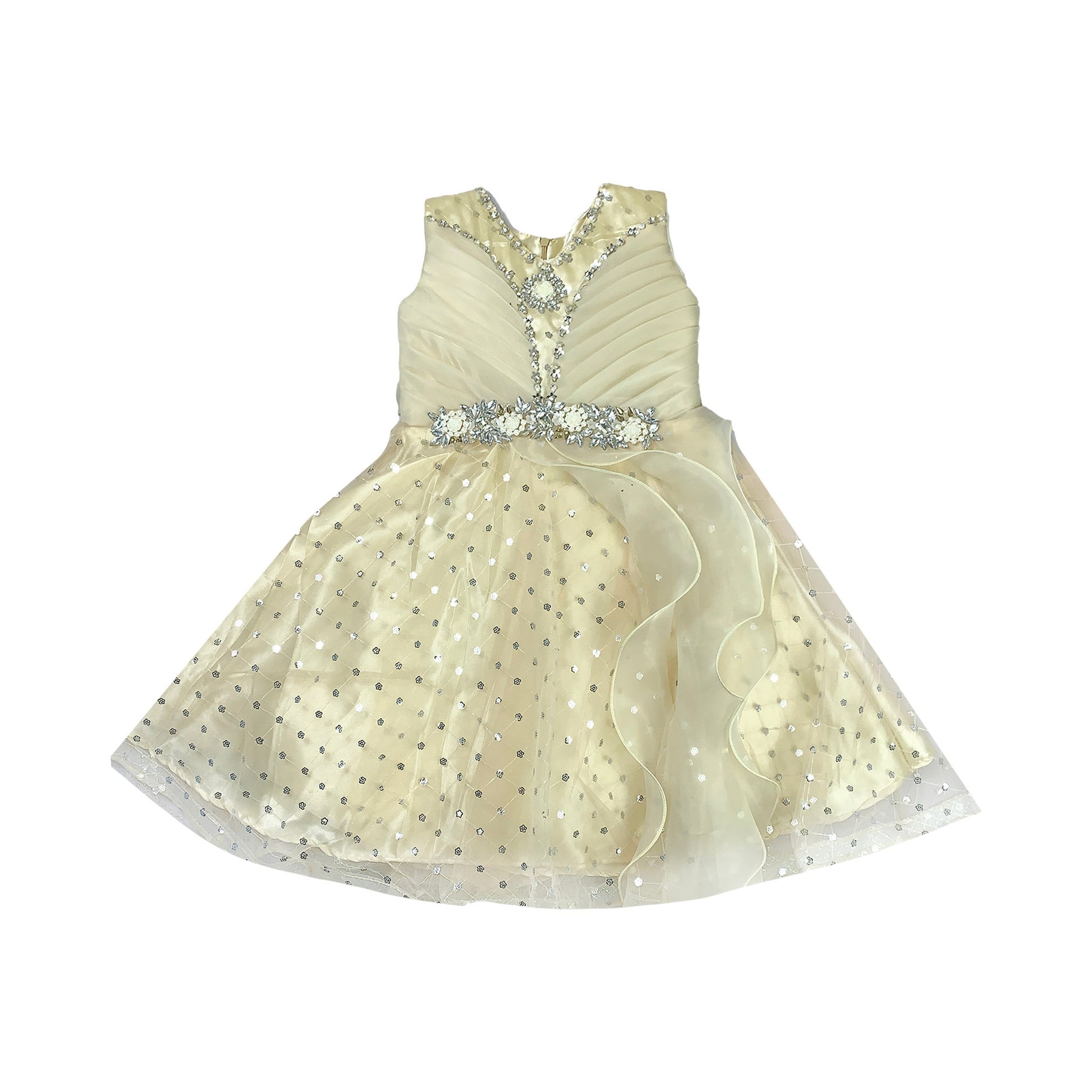 Girls Silk Frock in Pastel Cream with Soft Net Layers & Sequin Flowers